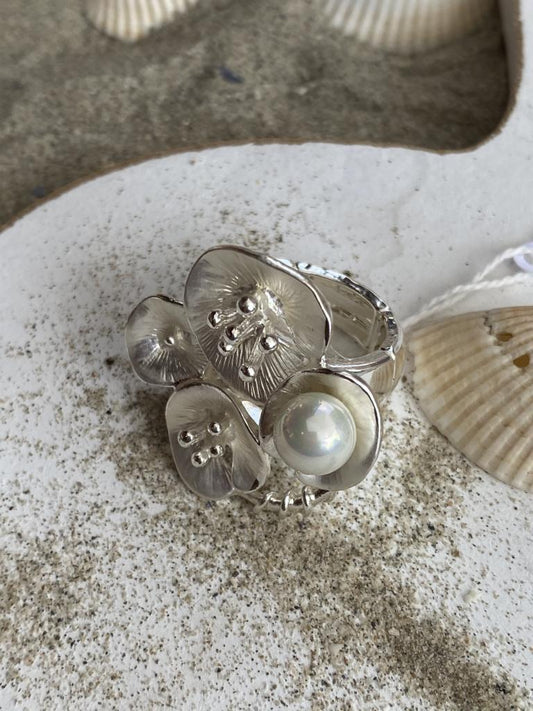 AusverkauftCocktail - Stretch - Ring Silber Blumen Perle